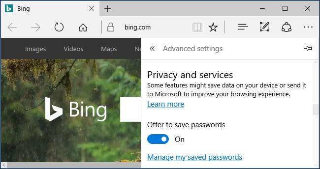 Windows 10'da Microsoft Edge'de menü> Ayarlar'ı tıklayın. Ayarlar bölmesinin altına kaydırın ve "Gelişmiş ayarları görüntüle" düğmesini tıklayın. "Gizlilik ve hizmetler" bölümüne gidin ve "Parolaları kaydetmeyi öner" seçeneğini "Kapalı" olarak ayarlayın.
