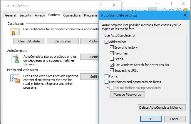 Internet Explorer'da menü> İnternet Seçenekleri'ni tıklayın. "İçerik" sekmesine tıklayın ve ardından Otomatik Tamamlama'nın sağındaki "Ayarlar" düğmesine tıklayın. Buradaki "Formlardaki kullanıcı adları ve şifreler" seçeneğinin işaretli olmadığından emin olun.