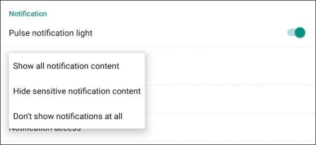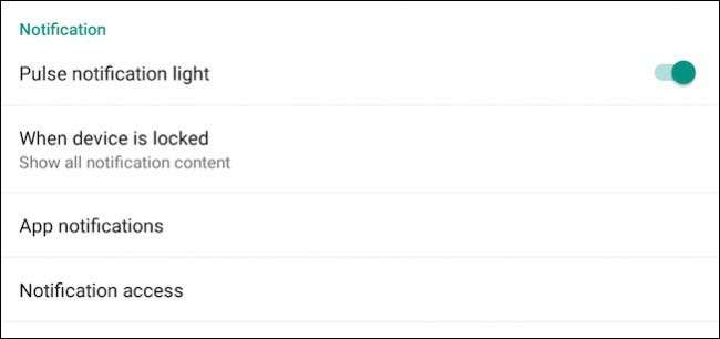 Ortaya çıkan sayfanın "Bildirim" başlığı altında dört seçeneği vardır. Nabız Bildirim Işığı ayarı kendinden açıklamalıdır: bir bildirim aldığınızda telefonunuzda bir LED ışığı yanıp söner. Ek olarak, Bildirim Erişimi ayarları konusunda endişelenmenize gerek yoktur; bir uygulama, ihtiyaç duyarsa size soracaktır.