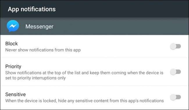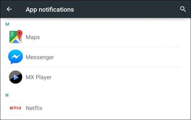 Bildirim Ayarları ekranında "Uygulama bildirimleri" ne dokunduğunuzda, tüm yüklü uygulamalarınızın kaydırılabilir bir listesi sunulur. Yukarıda belirtilen Messenger uygulamasına geçersek, bunun nasıl çalıştığını size gösterebiliriz. Lollipop'un listeyi alfabetik bölümlere ayırırken, Marshmallow'un basit alfabetik bir liste yerine alt başlıkları ortadan kaldırdığını belirtmekte fayda var.