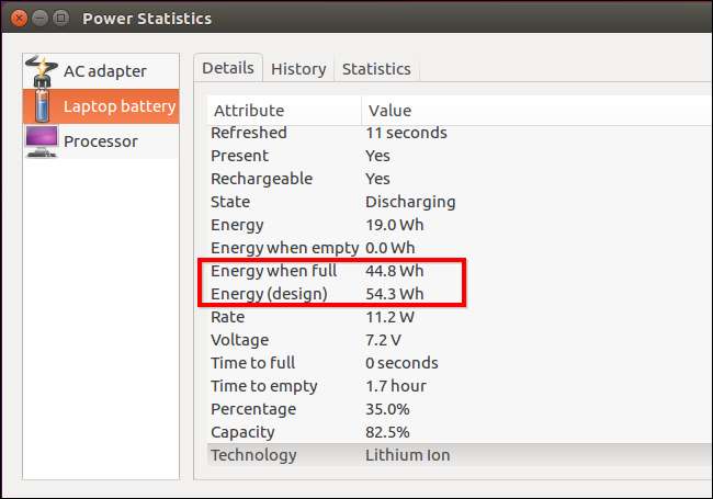 Örneğin, Ubuntu'da Power Statistics uygulamasını Dash'den açabilirsiniz. "Dizüstü bilgisayar pili" bölümüne bakın. "Dolu olduğunda enerji", pilinizin tam olarak şarj edildiğinde şu anda depolayabileceği güçtür. "Enerji (tasarım)", pilinizin tamamen şarj olduğunda orijinal olarak ne kadar güç depolayabileceğidir.