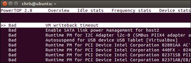 Intel’in açık kaynak PowerTOP yardımcı programı sisteminizi inceleyecek ve çeşitli güç tasarrufu özelliklerinin ne kadar iyi etkinleştirildiğini göreceksiniz, hatta sisteminizin güç tüketimini nasıl azaltabileceğiniz konusunda bazı öneriler sunacak. Bu bir komut satırı aracıdır, bu yüzden oradan çalıştırmanız gerekir. Bunu genellikle Linux dağıtımınızın yazılım havuzlarında bulacaksınız.