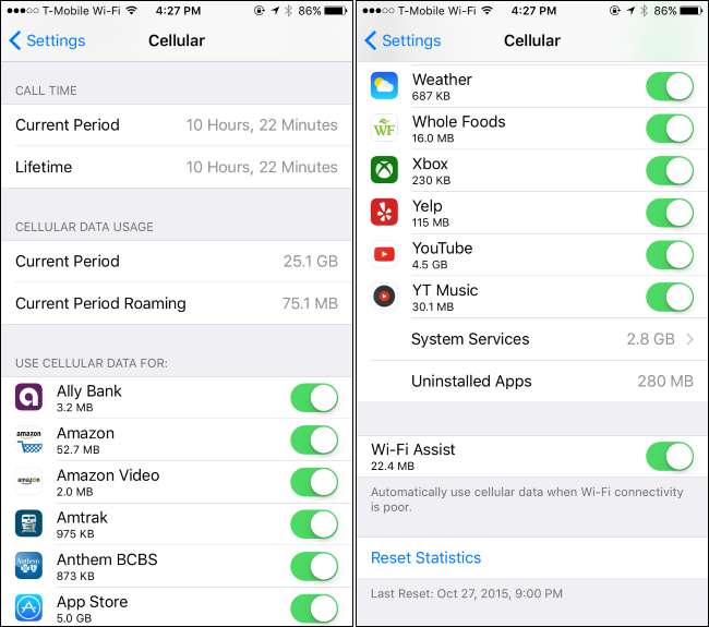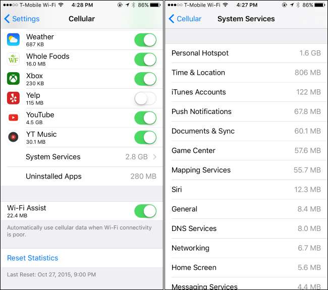 Ayarlar> Hücresel ekranda, uygulamalarınız tarafından sıfırladığınız andan itibaren kullanılan hücresel veri miktarını kontrol edin. Bu size, siz onları kullanırken veya arka planda bu verileri tam olarak hangi uygulamaların kullandığını söyleyecektir. İOS'ta yerleşik olarak bulunan "Sistem Hizmetleri" tarafından kullanılan veri miktarını görmek için aşağıya kaydırdığınızdan emin olun.