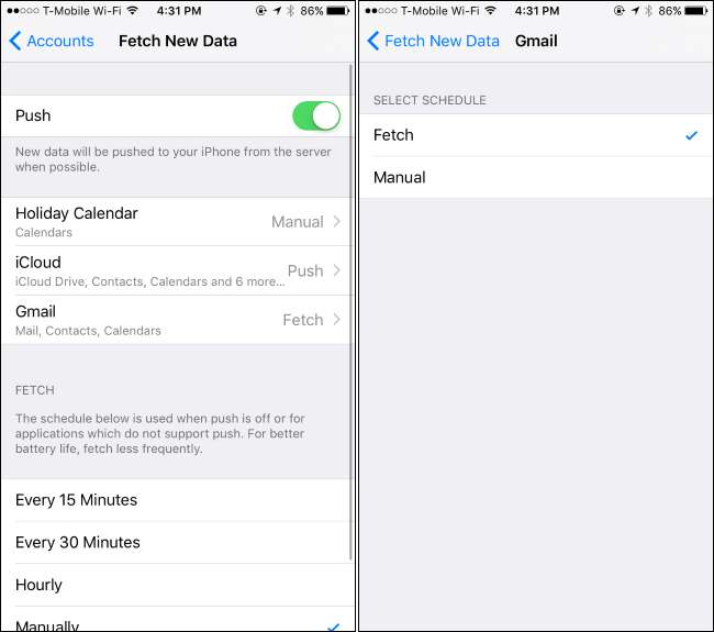 E-postanızı kendi programınıza göre kontrol etmeyi tercih ederseniz, yapabilirsiniz. Ayarlar> Posta> Hesaplar> Yeni Verileri Al'a gidin. Yeni e-postaları ve diğer verileri almak için seçenekleri buradan ayarlayabilirsiniz " elle . " Mail uygulamasını açana kadar telefonunuz yeni e-postaları indirmeyecektir.
