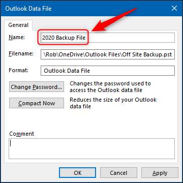Birden fazla PST dosyanız varsa veya dosyanın ne olduğunu kendinize hatırlatmak istiyorsanız, adını varsayılan "Outlook Veri Dosyası" ndan daha anlamlı bir şeye değiştirebilirsiniz.
