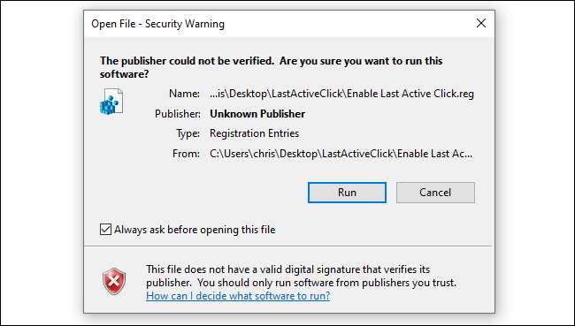 Dosyaya güveniyorsanız, sadece çift tıklatın veya sağ tıklayın ve "Birleştirme" yi seçin. Windows, Kayıt Defteri Düzenleyicisinin bilgisayarınızda değişiklik yapmasına izin vermek isteyip istemediğinizi soracaktır. Katılıyorum ve kayıt defteri dosyasının içeriği, PC'nizin kayıt defterinle birleştirilecektir.