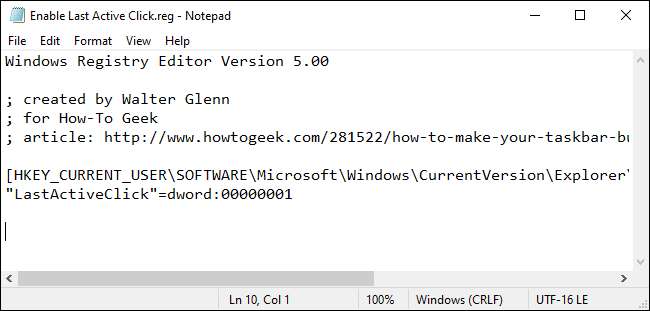 Altıncı satır, Windows'u "lastactiveclick" adlı bir DWORD değeri oluşturmasını ve değerini "1" olarak ayarlamasını söyler. (Değer zaten varsa, Windows değerini "1" olarak ayarlar.)