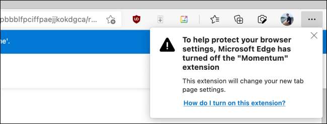 Uzantı yüklendikten sonra, kenarın uzantısını devre dışı bıraktığını söyleyen bir pop-up görürsünüz, çünkü başlangıç sayfasını değiştirmeye çalıştı. Şimdi manuel olarak etkinleştirmeniz gerekecek.