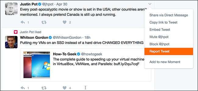 Twitter'da olmasına rağmen bazı geniş kurallar - taciz edici davranışlar, tehditler, taciz, nefret dolu dil, gizli bilgilerin sızdırılması gibi şeylerin aksine - bunlar çok iyi uygulanmaz. Hiç kimse Tweetleri gerçek zamanlı olarak incelemiyor, bu nedenle birisinin bir hesap oluşturması ve kapatılmadan önce yüzlerce taciz edici mesaj göndermesi kolaydır. Bu kişilerin durdurulmasının tek yolu Tweetlerini Twitter'ın moderatör ekibine bildirmektir: Eğer kuralları çiğnediklerini kabul ederlerse, bazı önlemler alınacaktır. İşte bir Tweeti nasıl bildireceğiniz aşağıda açıklanmıştır.