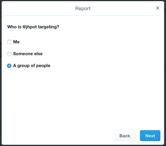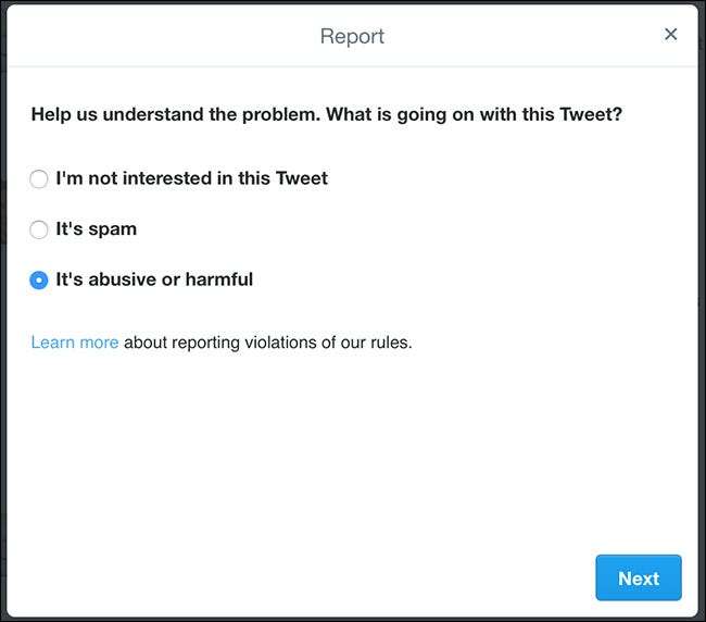 Açıkçası, ilki olayları bildirmek için bir neden değil. Yerine, blok veya bunun yerine kullanıcının sesini kapatın. Aksi takdirde, Tweeti bildirme nedeninizi seçin ve İleri'ye tıklayın veya dokunun.