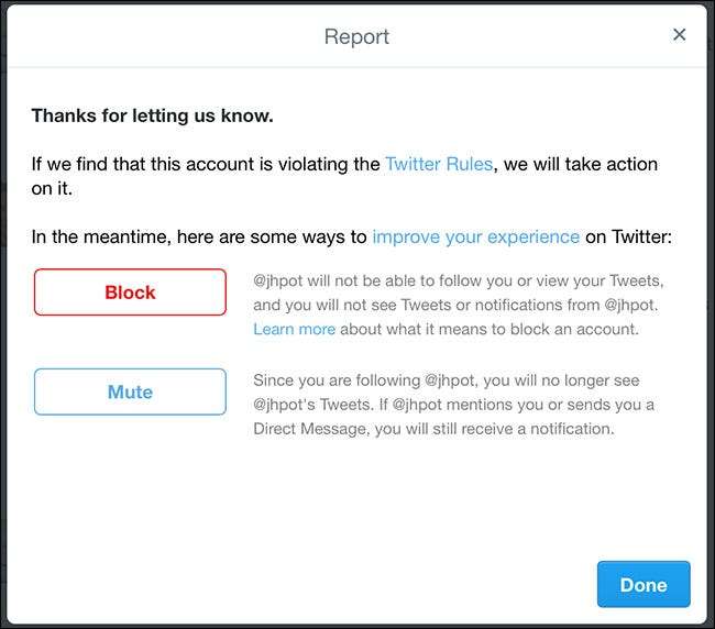 İşiniz bittiğinde, bildirdiğiniz Tweetini kullanan kullanıcıyı Engelleme veya Sesi Kapatma şansınız da olacak.