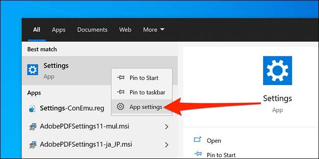 Ayarları sıfırlamaya başlamak için, Başlat menüsünüzü açın ve "Ayarlar" arayın. Sonuçlardaki uygulamayı sağ tıklatın ve "Uygulama Ayarları" seçeneğini seçin.