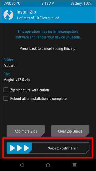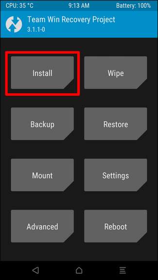 Özel kurtarma işleminizden, daha önce telefona aktardığınız Magisk ZIP dosyasını flaş edin. TWRP'de bu, "Yükle" ye dokunun, ardından Magisk dosyasını bulun anlamına gelir. "Resmi Yükle" ye dokunun.