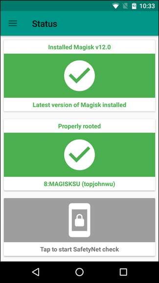 Kurulduktan sonra, o kötü çocuğu ateşleyin. Geçerli sürümü çalıştırdığınızı ve düzgün şekilde köklendiğini göreceğiniz durum sayfasında başlamalıdır. İsterseniz burada bir SafetyNet kontrolü de yapabilirsiniz, bunu tavsiye ederim.