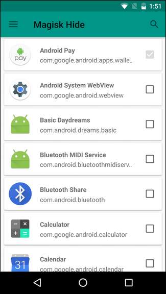 Magisk Hide dışında, bunların çoğu pasif olarak etkindir (yani arka planda çalışırlar). Etkinleştirildiğinde, menüde yeni bir seçenek görünecektir - Magisk Hide. Burada Magisk'e hangi uygulamaların varlığını (ve durumunu) gizleyeceğini söyleyeceksiniz. Android Pay varsayılan olarak seçilidir, ancak örneğin Netflix ve Pokémon Go gibi köklü bir cihazda çalışmayacak olanları da seçebilirsiniz.