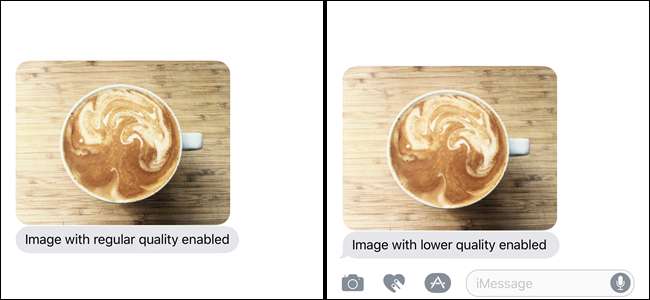 Mesajlar ekranının altına kaydırın ve açmak için Düşük Kaliteli Görüntü Modu kaydırıcı düğmesine dokunun (yeşile dönecektir). Artık, iMessage'da gönderdiğiniz tüm görüntülerin kalitesi daha düşük kalitede ve boyut olarak daha küçük olacaktır.