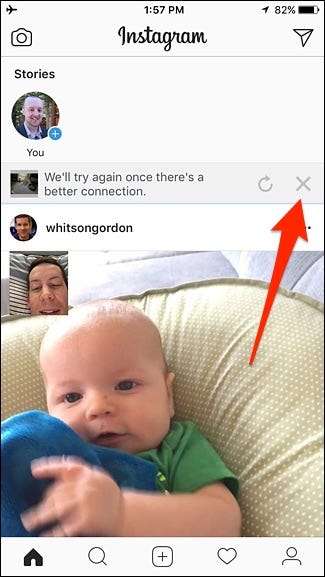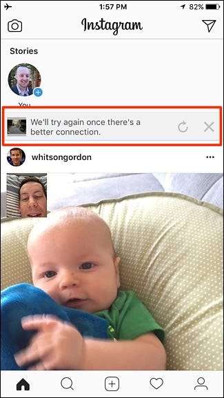 Açıkçası, fotoğraf başarılı bir şekilde yayınlanmayacak ve "Daha iyi bir bağlantı olduğunda tekrar deneyeceğiz" yazan küçük bir banner göreceksiniz. Bu noktada, düzenlediğiniz fotoğraf yerel olarak telefonunuza kaydedilir.