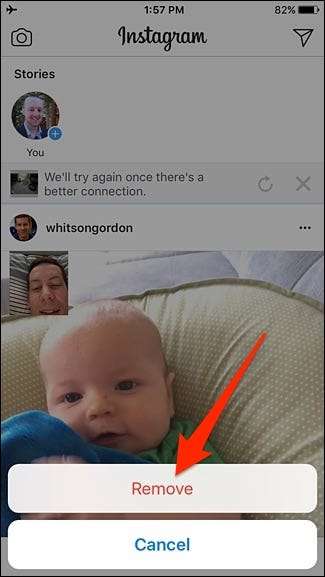 Ardından, alttaki açılır pencere göründüğünde "Kaldır" a dokunun. Bu, uçak modunu kapattığınızda Instagram'ın yüklemeyi yeniden denemesini engelleyecektir.
