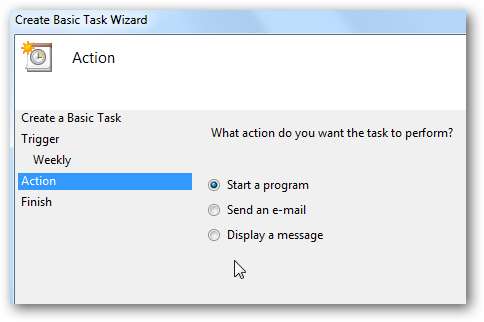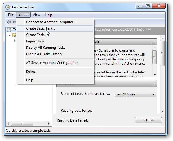 Görev Zamanlayıcı açılır ve Eylem'e tıklayıp ardından seçimini yapmak isteyeceksiniz. Temel Görev Oluşturun .