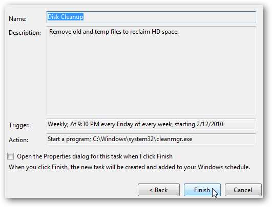 Ardından zamanlanan görevin bir özeti gösterilir ve her şey doğru görünüyorsa Bitir'i tıklayın.