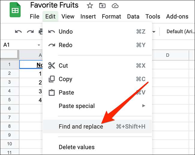Sonra, içinde aramak istediğiniz elektronik tabloyu açın. Menü çubuğunda, "Düzenle" yi tıklatın ve sonra "Bul ve Değiştir" seçeneğini seçin. Alternatif olarak, Mac'te Windows veya Command + Sh Shift + H'de CTRL + H tuşlarına basın.