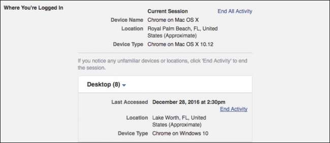 Bu aynı zamanda Facebook hesabınızda hangi makinelerin oturum açtığını görün . Tanımadığınız herhangi bir şey varsa, bunları uzaktan kapatabilirsiniz. (Muhtemelen burada sadece kendi makinenizi göreceksiniz, ancak asla çok dikkatli olamazsınız).