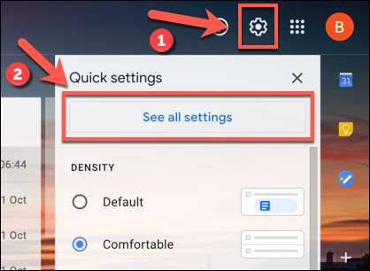 Başa çıkmak Gmail web sitesi ve başlamak için sağ üst köşedeki "Ayarlar" dişli simgesini tıklayın. Görünen "Hızlı Ayarlar" menüsünden "Tüm Ayarları Gör" seçeneğini seçin.