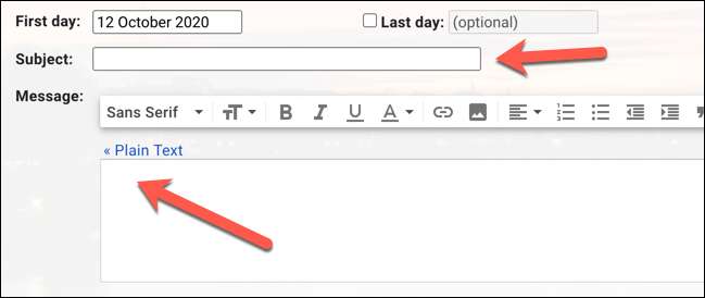 Tarih aralığı ayarlandıktan sonra, göndermek istediğiniz mesajı otomatik olarak ayarlamanız gerekir. "Konu" kutusundaki e-posta için bir konu başlığı sağlayın ve ardından "Mesaj" kutusuna bir mesaj yazın.