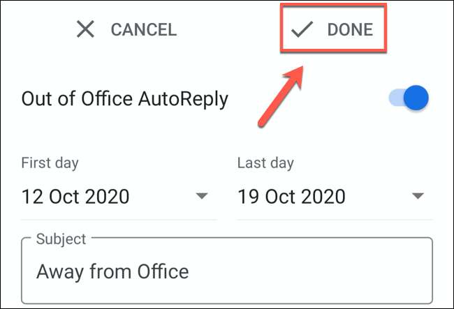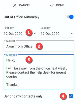 Son tarihi etkinleştirmek istiyorsanız, "son gün" onay kutusunu etkinleştirmeniz gerekir. Aksi takdirde, Gmail, manuel olarak devre dışı bırakana kadar ofis mesajlarını göndermeye devam edecektir.