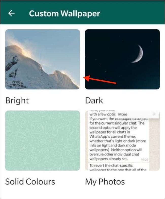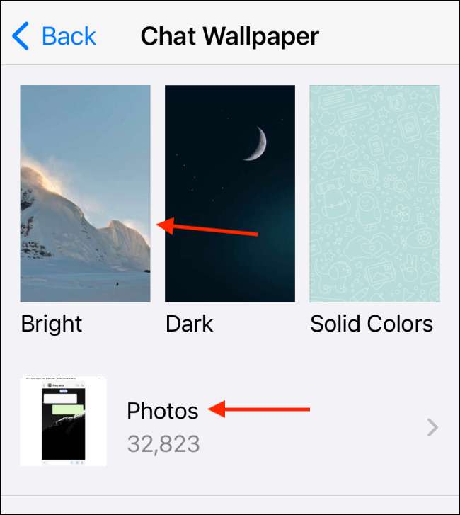 Bir sonraki ekrandan, "parlak" "koyu" ve "katı renkler" duvar kağıdı koleksiyonlarına göz atabilirsiniz. Kendi resminizi arka plan olarak seçmek istiyorsanız, "Fotoğraflar" seçeneğini seçin.
