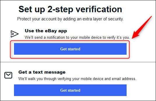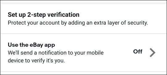 Bir sonraki sayfada iki seçenek vardır: "2 adımlı doğrulama ayarlayın" ve "Ebay uygulamasını kullanın." Her iki seçeneğe de dokunarak sizi aynı sayfaya götürür.