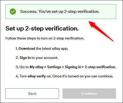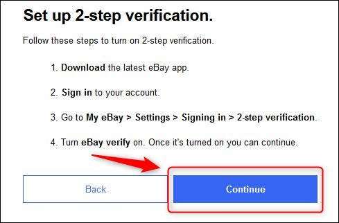 EBay web sitesi, ekrandaki talimatları izleyerek mobil uygulamada iki adımlı doğrulamayı açmanızı isteyecektir. Bu adımı tamamladığınızda, "Devam et" i tıklayın.