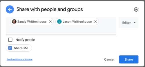 Paylaşmak istediğiniz kişiyi veya kişiyi eklerdikten sonra, izinleri ayarlayın, isteğe bağlı olarak insanlara bildirmek ve bir mesaj eklemek için kutuyu işaretleyebilirsiniz. Bu, onlarla bir belge paylaştığınızı bildirmelerine izin vereceklerine bir e-posta gönderir. "Gönder" i tıklayın.