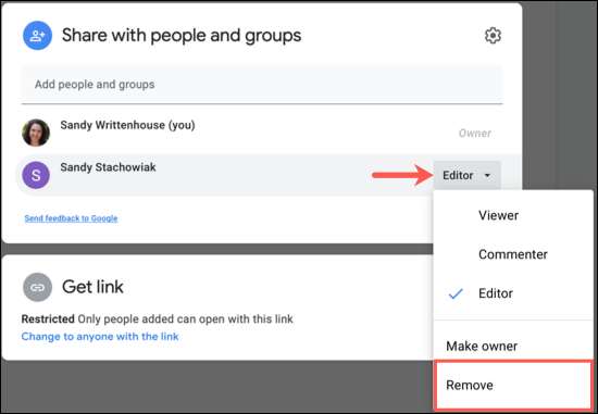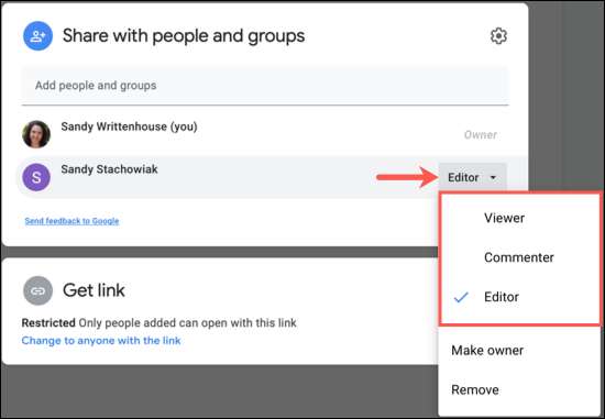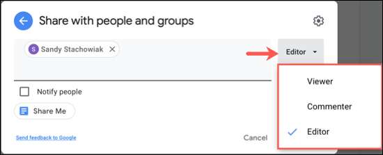 Sağdaki, izni seçmek için açılır kutuyu kullanın. Editör, görüntüleyici veya yorumcu seçebilirsiniz.