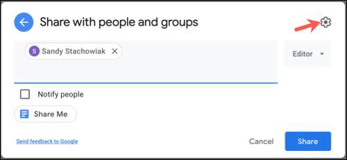 Yukarıdakiler varsayılan izin ayarlarıdır, ancak isterseniz birkaç ayar yapabilirsiniz. Paylaşım penceresinde, sağ üstteki vites simgesini tıklatın.