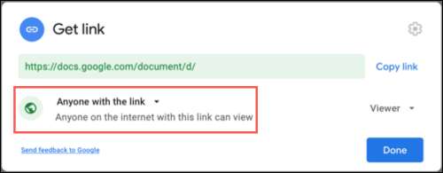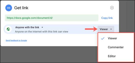 Kullanmak Bağlantıya sahip olan herkes Belgeye erişmek için kimsenin yanına izin vermek için. Sonra sağa, görüntüleyici, yorumcu veya editörü seçin. Bu izni, bağlantıyı kullanarak belgeye erişen herkes için geçerli olacaktır.