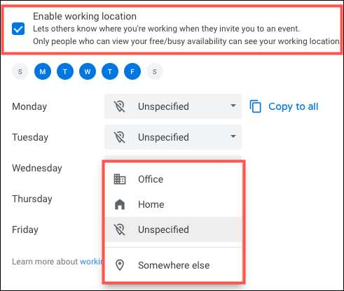 Sonra aşağıda, çalışmayı planladığınız haftanın her gününü tıklatın. Bundan sonra, açılır kutusundan her gün için bir yer seçin.