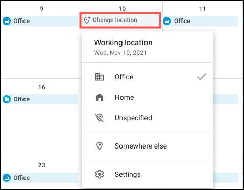 Bir tek gün için bir yeri değiştirmeniz gerekiyorsa, örneğin, belki bir gün ofis yerine evden çalışıyorsunuzdur, bu kolaydır. İmlecinizi konumu üzerine getirin ve "Konum Değiştir" diyecektir. Tıklayın ve ardından o gün için yeni konumu seçin.