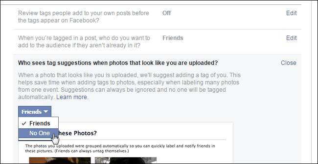 NOT: Size burada nasıl değiştirileceğini gösterdiğimiz ayar, yalnızca arkadaşlarınız sizi içeren resimler yayınladığında adınızın önerilmesini engeller. Sizi yine de fotoğraflarda etiketleyebilecekler, yalnızca bunu yapmaları istenmeyecek.