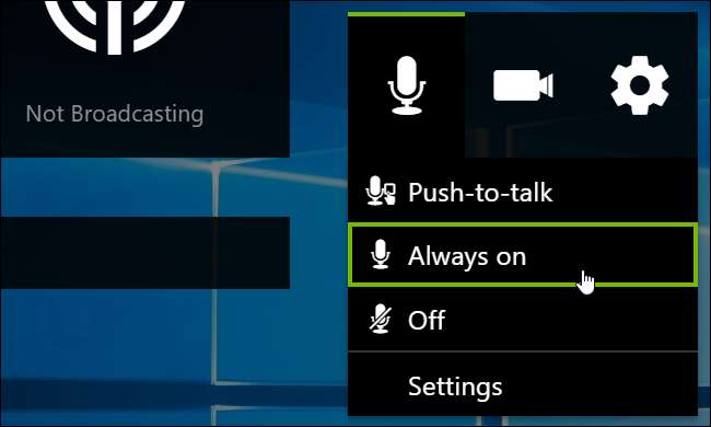 Mikrofonunuzun nasıl çalıştığını yapılandırmak için, kaplamayı açın ve mikrofon simgesini tıklayın. Bir mod seçin - Her Zaman Açık, Bas-Konuş veya Kapalı. Varsayılan olarak, bas-konuş tuşu Mezar tuşudur ( `) klavyenizdeki Sekme tuşunun hemen üzerinde. Ayarlar> Klavye Kısayolları'na giderek bunu başka bir tuşla değiştirebilirsiniz.