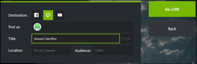 Aslında GeForce Experience ile yayına başlamak için önce yayınlamak istediğiniz oyunu başlatın. Ardından, kaplamayı açmak için Alt + Z tuşlarına basın ve ardından "Canlı Yayınla" düğmesini tıklayın. Oyununuzu yayınlamaya başlamak için "Başlat" seçeneğini tıklayın.