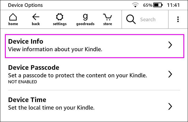 Not: Daha eski bir Kindle'ınız varsa (veya Kindle yazılımının eski bir sürümünü kullanıyorsanız), menüler biraz farklı görünebilir. Hala "cihaz bilgisi" arıyorsun.