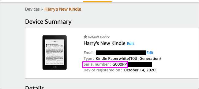 "Seri numarası" altında, Kindle'ın seri numarasını göreceksiniz. İlk karakter bloğunu arıyorsunuz. Bu örnekte "G000PP" görebilirsiniz, bu da bir Kindle CapeWhite 4'e karşılık gelir (öneki bölümünüzü karşılaştırabilirsiniz. aşağıdaki tablo. ).