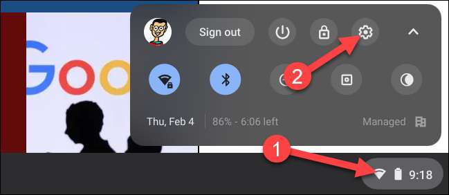 İkinci yöntem için, Krom OS ayarlarına gireceğiz. Yine, Hızlı Ayarlar panelini açmak için raftaki saat simgesini tıklatın. Ardından, Ayarlar menüsünü açmak için Dişli simgesini seçin.