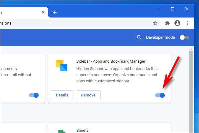 Uzantıyı devre dışı bırakmak istiyorsanız ancak kaldırmazsanız, kapatmak için yanındaki düğmeyi tıklayın. Herhangi bir zamanda, uzantılar sekmesine geri dönebilir ve tekrar çevirerek tekrar etkinleştirebilirsiniz.