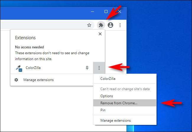 Alternatif olarak, bir uzantıyı hızlıca kaldırmak için, araç çubuğundaki "Uzantılar" düğmesini de tıklayabilirsiniz, uzantıların adının yanındaki dikey elips düğmesini tıklatın, ardından menüden "Chrome'dan Kaldır" ı seçin.