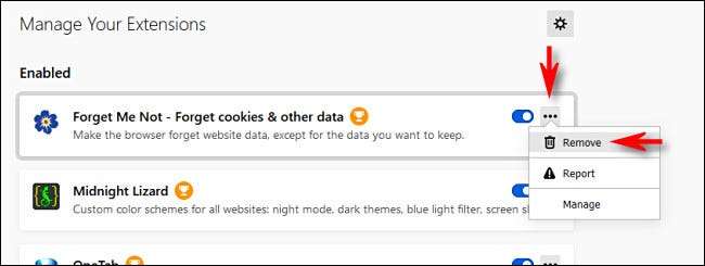 Bir uzantıyı tamamen kaldırmak ve kaldırmak istiyorsanız, listedeki uzantının yanındaki Elips düğmesini (üç nokta) tıklatın ve "Kaldır" ı seçin.