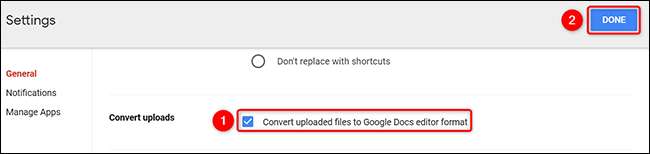 Bir sonraki “dönüştürme Yüklemeler,” “Ayarlar” penceresinde, “Google Dokümanlar Editör Format Yüklenen Dosyalar dönüştürme” seçeneğini etkinleştirin. Ardından sağ üst köşedeki “Done”.