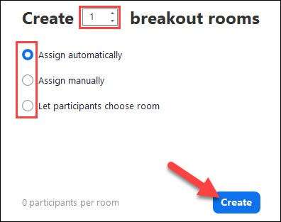 Breakout oda seçenekleriyle bir açılır pencere görünecektir. Oda sayısını ve katılımcıların onlara nasıl ayrılacağını seçebilirsiniz.