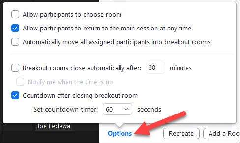 Sonra, bazı ek ayarlar için "Seçenekler" i tıklayın. Breakout Rooms Oturumları'na zaman uzunluğu koyabilir ve odaları kapatmadan önce insanlara zaman kazandırmak için bir geri sayım seçebilirsiniz.